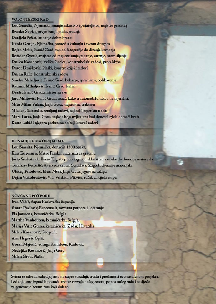 Mnogo je ljudi bilo uključeno u ovu gradnju, i na različite, ponekad gotovo mistične načine. Nekako se poklapalo da su se pravi ljudi nalazili na pravim mjestima upravo onda kada je to trebalo. I u ritmu određenom janjagamom sve se posložilo baš kako treba. Od samog Lou-a koji je tijekom izložbe Chawan u Opatiji 2011. ponudio na poklon 1300 komada opeke i svoje znanje, vrijeme i iskustvo da se sagradi peć, preko Gorana, Tomislava, Krste i svih drugih koji su reagirali u pravi čas. Ne zaboravimo niti donacije u novcu, koje su cijelu stvar dobrim dijelom omogućile, Karlovačka županija, Ecoconsult i nekolicina umjetnika. I na kraju zaista ono najvažnije, dani i dani volonterskog rada (teškog fizičkog) velikog broja naših prijatelja. Hvala svima!