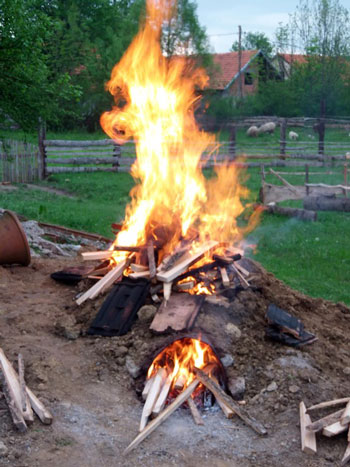 I uspjeli. U jutro sam se probudio, nakon kratke noći spavanja i prošetao livadom sakupljajući darove za ovo prvo magično paljenje. Tako skupljene plodove naše zemlje posložio sam u zdjelu i postavio pored vrata peći. Sa druge strane sam stavio čašicu sa šljivovicom, za uspješno paljenje. 8.00 smo započeli, skroz laganom vatricom, u najdonjem dijelu peći.