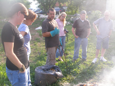 Then, preparing the glazes and decorating the pieces, preparing wood for the fire, arranging the pieces in the hole, firing it and 'looking after' the fire. These fires burn for a couple of hours, and the cooling of the pieces lasts till morning. During the firing, the participants spend their time exchanging experiences and friendships, doing other techniques and evaluating the achieved results before the workshop ends.