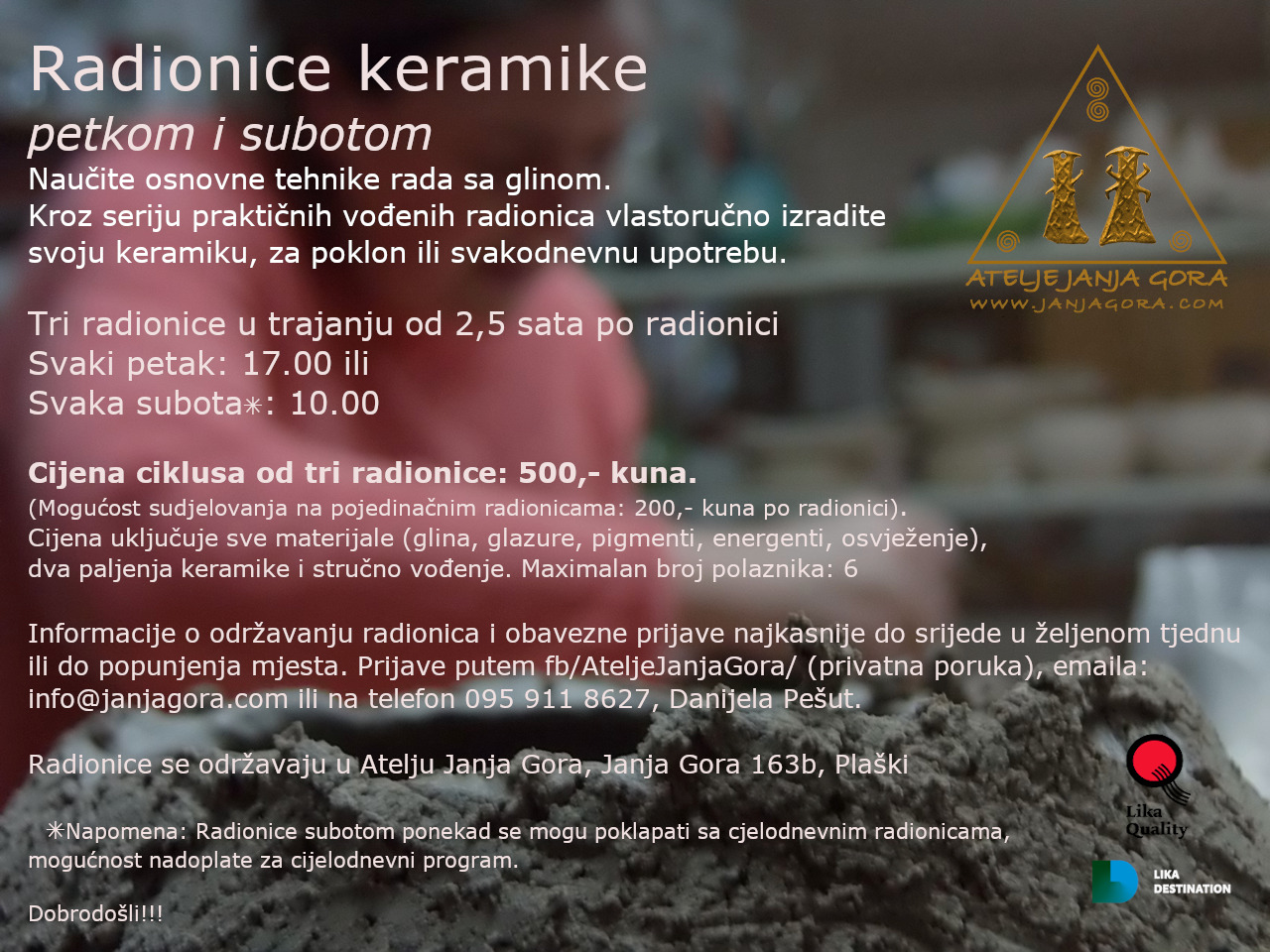 Za sve one koji se ovom umjetnošću - hobijem žele započeti baviti od samog početka i time upotpuniti svoje slobodno vrijeme i potrebu za kreativnim izražavanjem kao i za one koji se keramikom već bave a žele upoznati nove pristupe i mogućnosti. Kako smo svjesni svoje pozicije, malo izvan centara zbivanja, odlučili smo sve radionice organizirati kao neobavezne i proizvoljne. To znači da svatko tko se na njih prijavi sam može odrediti ritam, brzinu i količinu usvajanja informacija.